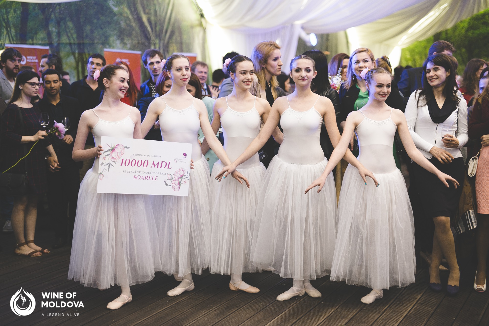 The event was hosted by Mr. Eugene Bulgaru and Mrs. Vasilica Marinela Ardelean, international expert in wines, the author of the "Wine Book of Romania". The volume, which includes 43 Wines of Moldova as well, was released at the Wine Vernissage, connoisseurs and wine enthusiasts had the opportunity buy it at the event. The festive atmosphere of the Vernissage, but at the same time relaxing, was upheld by the band "Divertis Duo," which performed instrumental compositions in the style of "chanson française". Guests of the Wine Vernissage had a nice surprise: ballerinas from the ballet studio "Soarele", the oldest ballet school in Moldova, with a history of 65 years, provided a great show. They danced to the music accompanied by the saxophonist Cristian Tarsu, the beneficiary of the previous edition of the Wine Vernissage, whose saxophone was purchased from the sale of tickets to the Wine Vernissage. The revenue from the tickets sale for this edition of the Wine Vernissage, will be again donated to support young talents. Beneficiaries of the anniversary edition will be the talented young people from Ballet Studio "Soarele", which will be able to purchase costumes and props for performances.